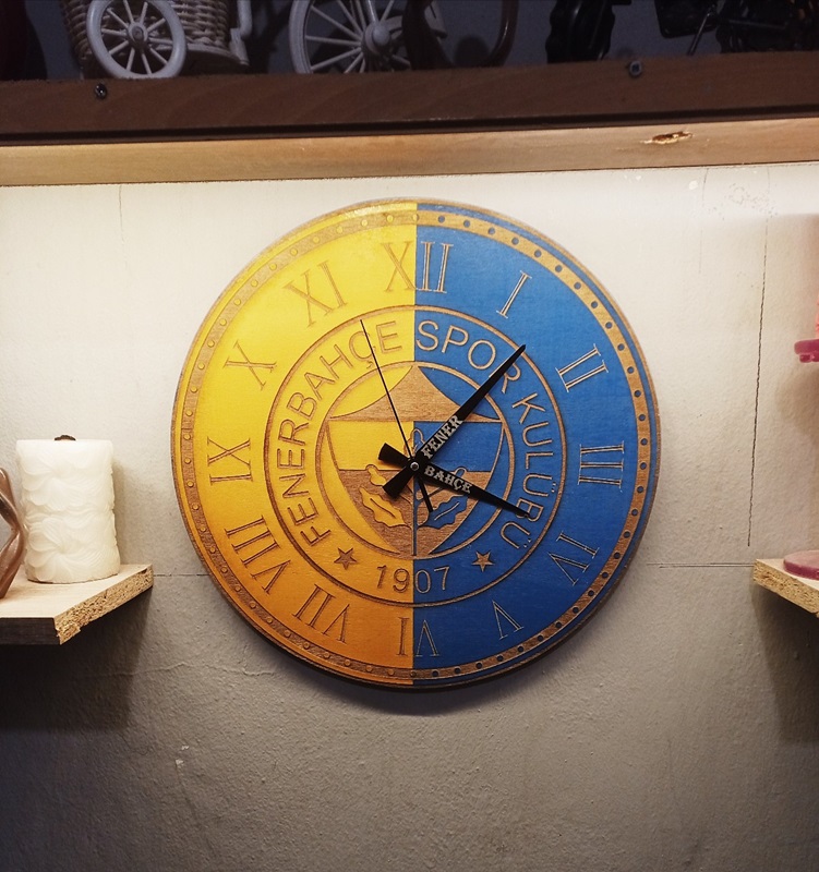 • Ahşap lazer işleme 38x38cm fenerbahçe temalı duvar saati.