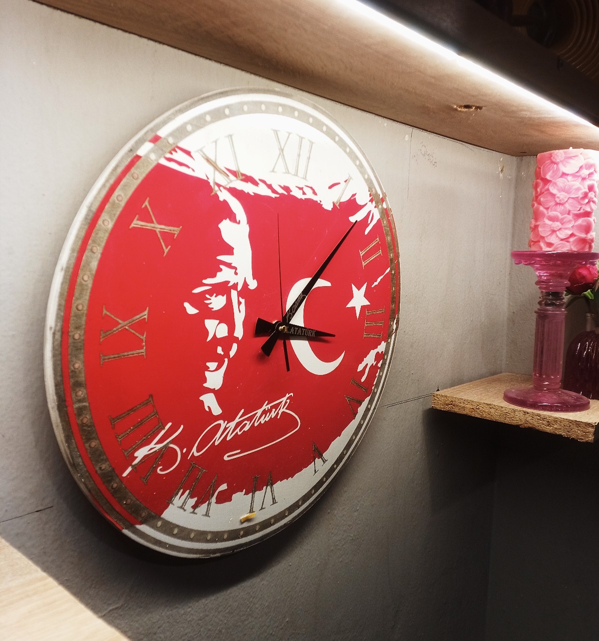 • Ahşap lazer işleme 38x38cm Türkiye ve Atatürk temalı duvar saati