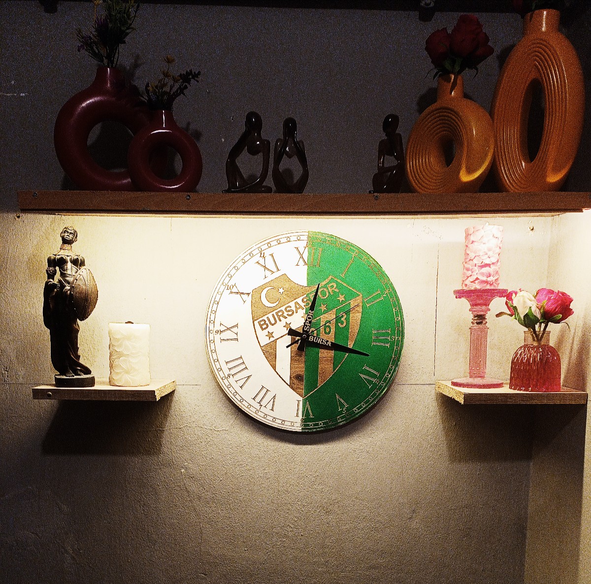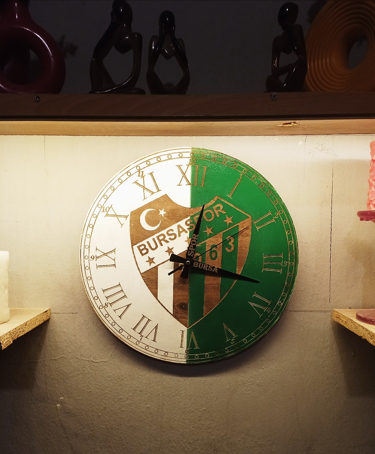 • Ahşap lazer işleme bursa spor temalı dekoratif 38x38cm duvar saati.
